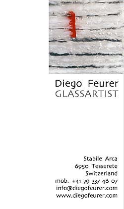 February, 10, 1955 in St. Gallen, Switzerland. Diego Feurer lives and works in Tesserete, Switzerland. Originally a CAMS-operator for Swiss TV, Feurer's artistic eye led to his fascination with glass. In 1980, he began his career in art glass by creating artistic stained-glass windows. In the early 1990's, he advanced his education in glass by attending fusing seminars with various artists, including Giles Bettison, Matthew Curtis, Linda Ethier and Rudi Gritsch. He began another collaboration creating artistic glass windows with Fra Roberto, an important Swiss artist, in the 1980s which continues today. Feurer received a major commission in 1999 from the Swiss Office of Construction and Logistics to create a glass fused ceiling for a multipurpose hall. The work is 45 square meter in size and is comprised of 60 panels (each 61cm x 122cm) and weighs 3 tons. It was also in the 1990's that Feurer started to blow glass, attending various workshops with such renowned artists as Giles Bettison. In addition to his own work, he assists other artists in the realization of their works of art. In 1998 he established his glass blowing studio in Tesserete, Switzerland. In his latest work, Feurer developed an entirely original form of murrine, the glass mosaic. This process allows him to fade his colors, giving a more painterly effect to his work, which was not previously possible with normal murrine techniques. |